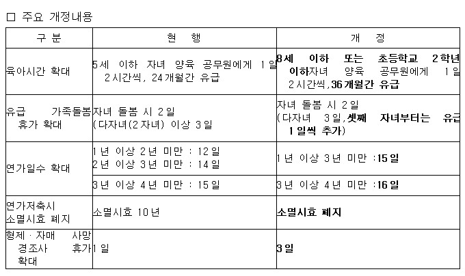 1. 육아시간 확대(기존 5세이하, 24개월 유급) -> 개정 8세이하 또는 초등2학년 이하, 36개월 유급