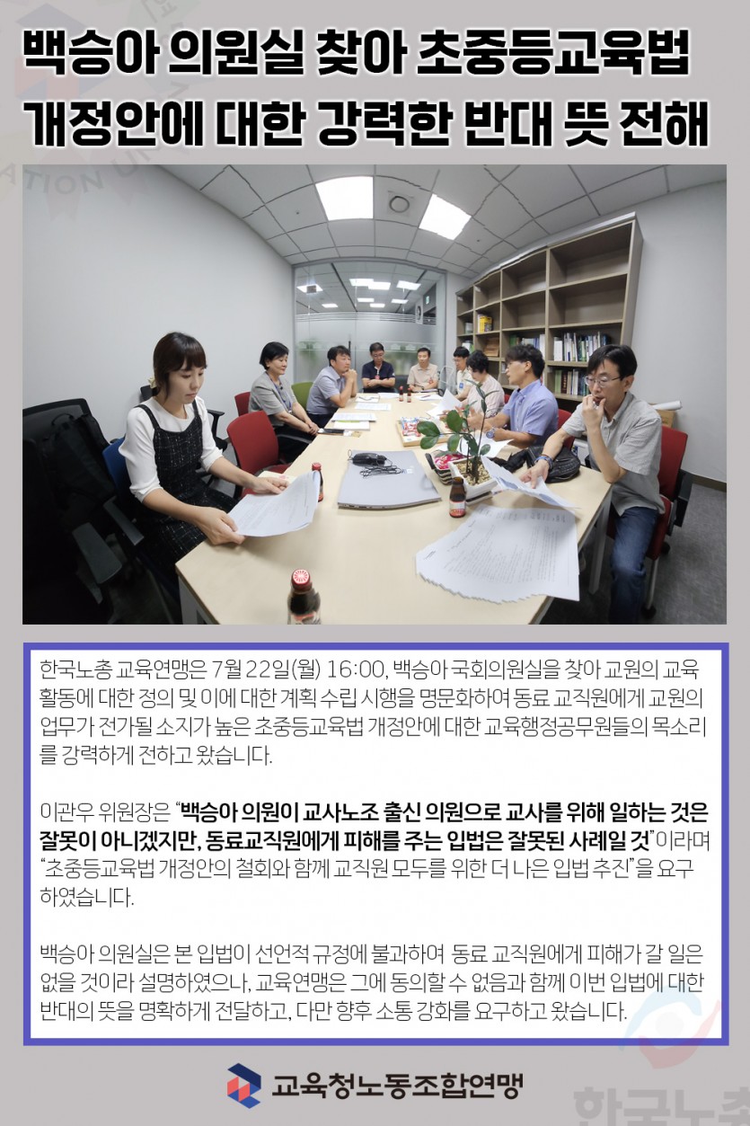 교육연맹 백승아 의원실 찾아 초등중교육법 개정안에 대한 강력한 반대 의견 전달